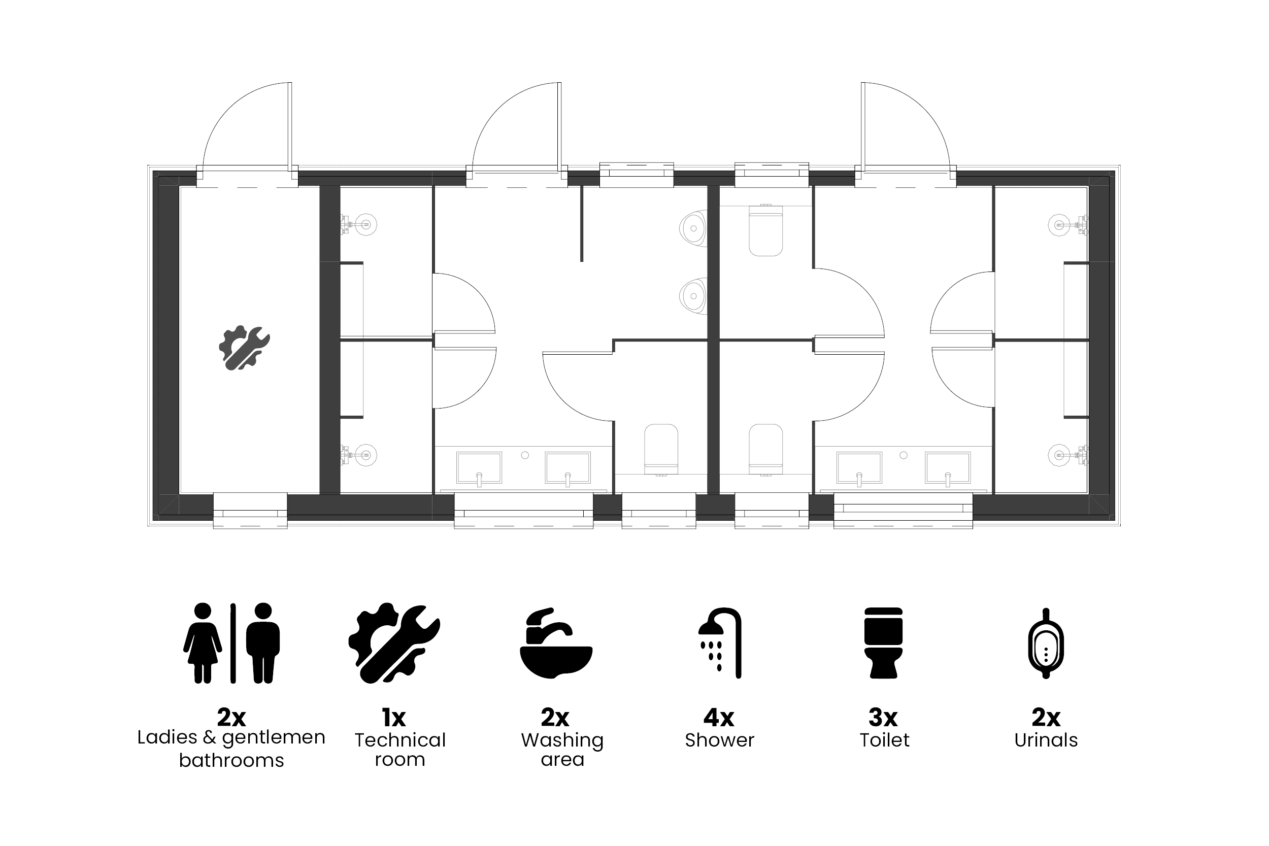 Model GM-4D.3WC+TCH from the STANDARD Line is a durable and functional solution for high-traffic locations —ideal for campsites, festivals, rest areas, and public facilities.